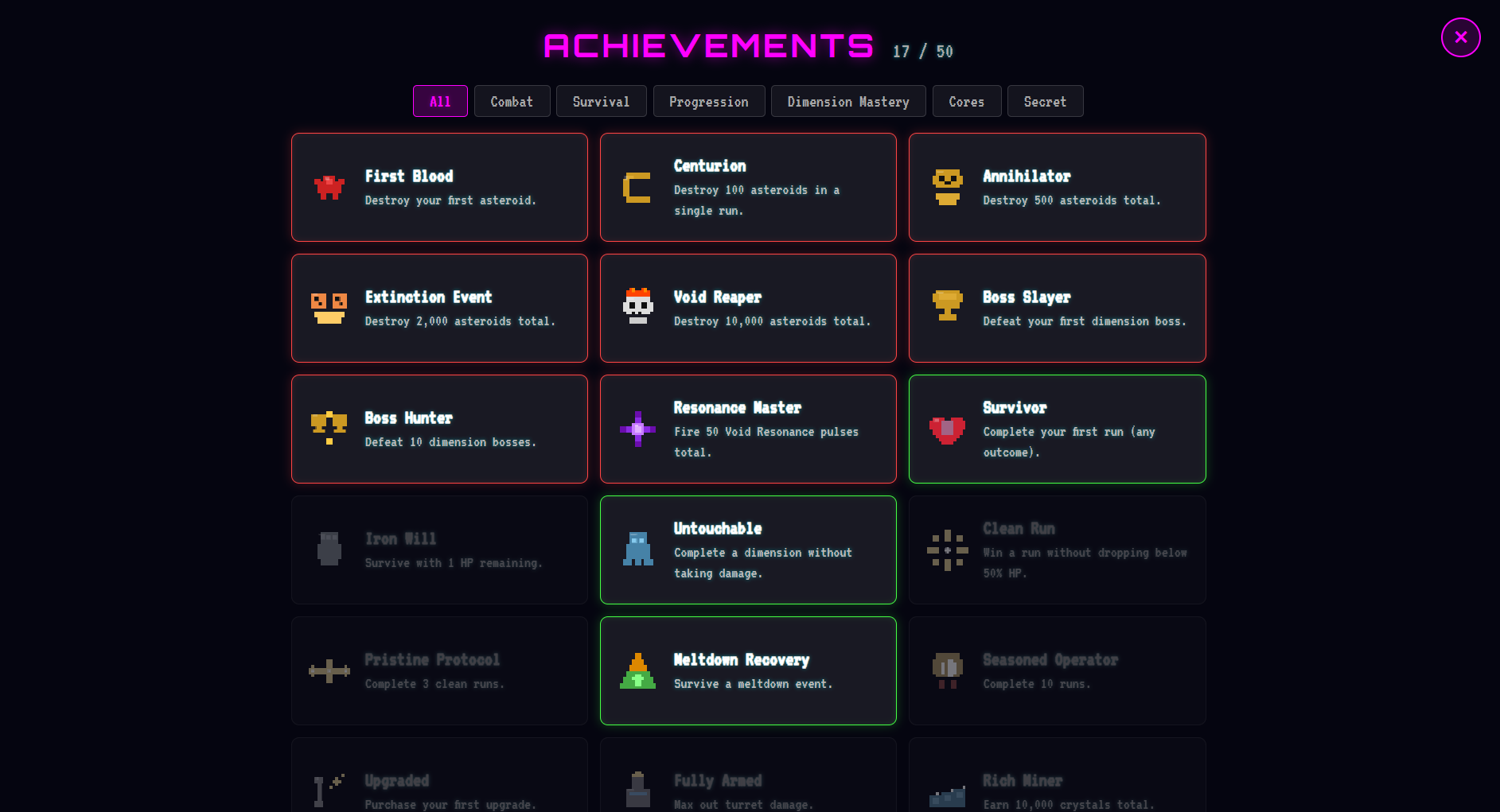 Tracked across 6 categories: Combat, Survival, Progression, Dimension Mastery, Cores, and Secret. Some are milestones. Some are challenges. Some require you to do things you didn’t think were possible.