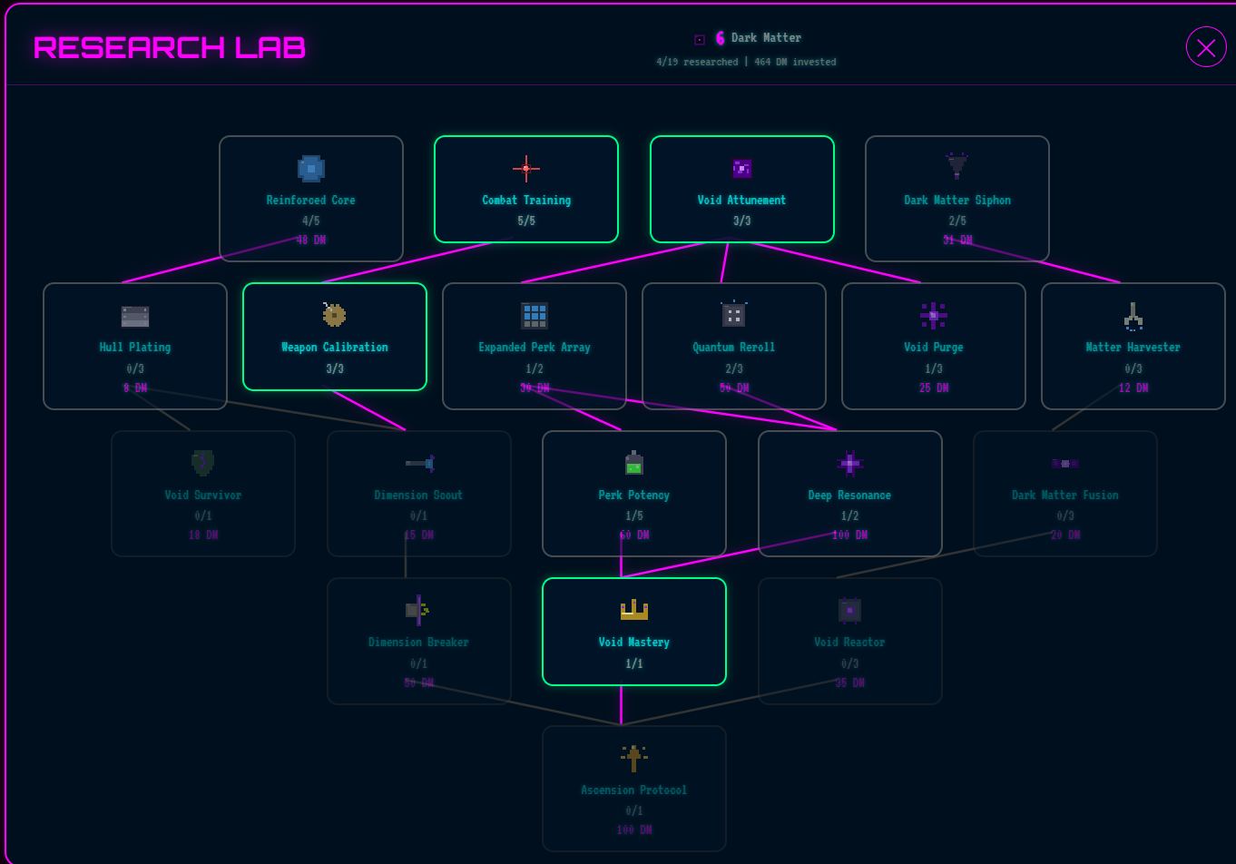 Dark Matter earned during runs is spent between runs on permanent upgrades across 5 tiers. Reinforce your core. Train your weapons. Expand your perk offerings. Unlock Void Purge, Matter Harvester, and the Ascension Protocol that opens the 7th dimension slot.