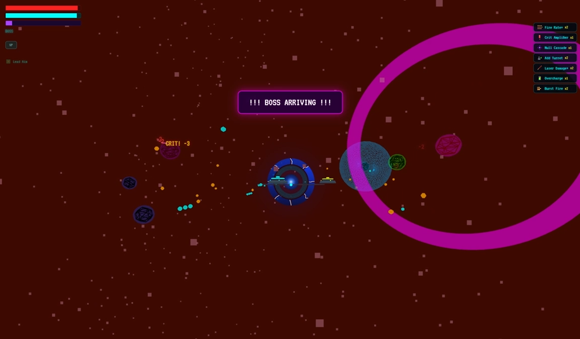 - Charged Core — Builds toward a devastating screen-clearing discharge that costs HP to fire